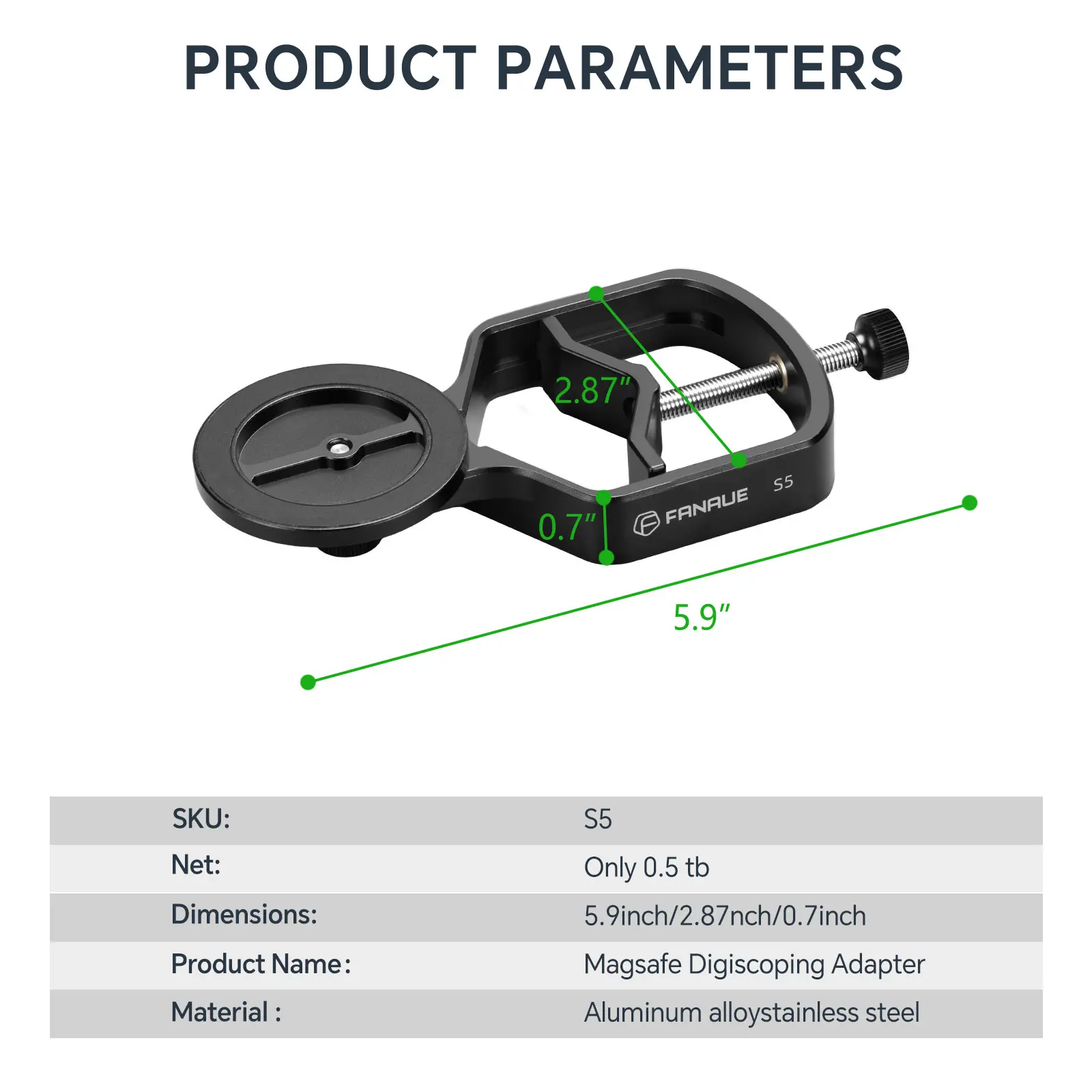 Unlock the full potential of your telescope or spotting scope with our Magnetic Universal Spotting Scope Phone Adapter. Designed specifically for iPhone users, this innovative metal telescope mount allows you to easily capture stunning photos and videos through your telescope's eyepiece. With a maximum eyepiece width of 2.16 inches, you can explore the universe in unprecedented detail. Crafted from durable aluminum alloy and stainless steel, this lightweight adapter is easy to carry on all your outdoor adventures. Experience fast focus and effortless imaging while enjoying wide compatibility with various iPhone models.